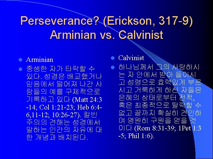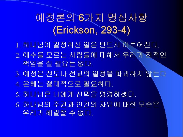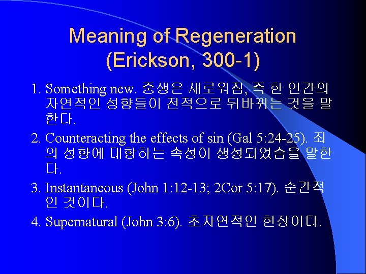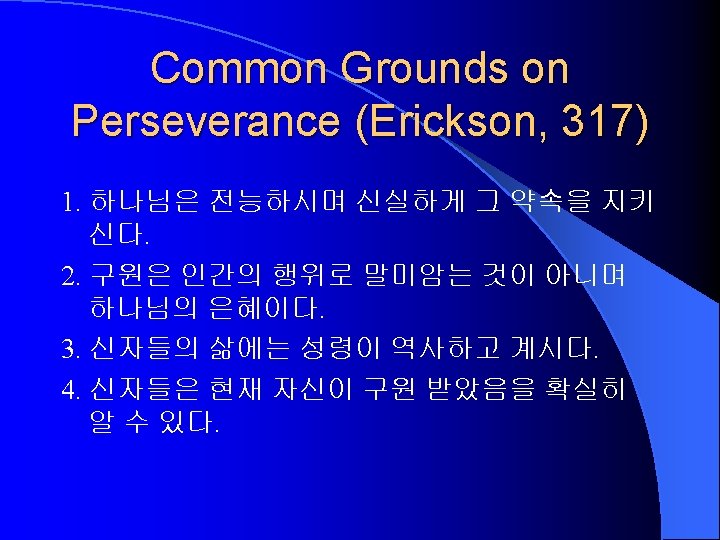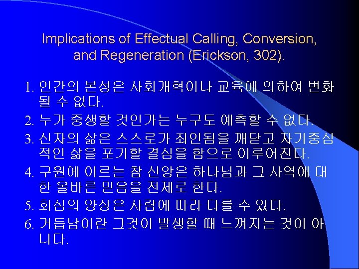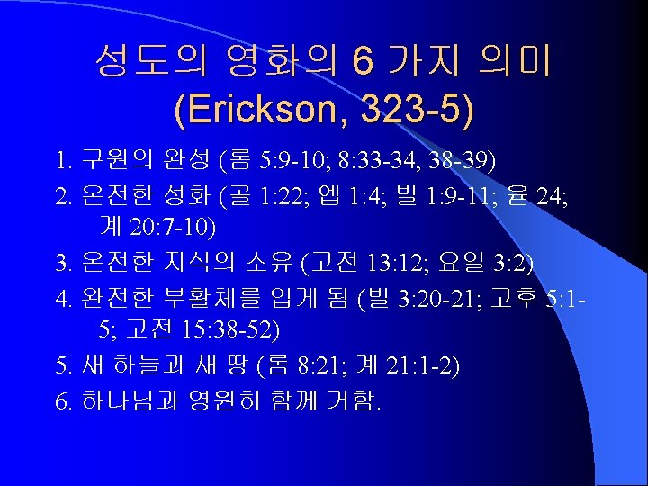 Characteristics of Sanctification (Erickson, 314 -5) 1. Supernatural (1 Thes 5: 23). 초자연적인 하나님의 역사. 개혁이 아니다. 2. Progressive (Phil 1: 6). 점진적인 역사. 3. Conforming to Christ himself (Rom 8: 29). 궁극적 인 목표는 그리스도이다. 4. The work of the Holy Spirit (Gal 5: 16, 22 -25). 성 령의 역사 5. Role for the believer (Phil 2: 12). 성도의 능동적 역할을 요구한다.