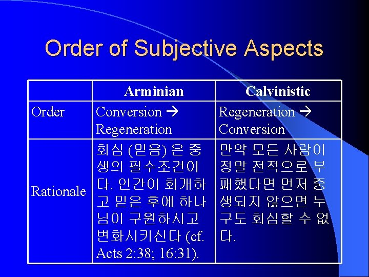 Ordo Salutis (Order of Salvation) 1. Antecedents: Election 택정 Effectual Calling 유효한 부르심 2. Beginning: (1) Objective: Union with Christ; Justification 칭 의 Adoption 양자됨 (2) Subjective: Conversion 회심; Regeneration 중생 3. Continuation: Sanctification 성화 4. Perseverance 견인 5. Glorification영화