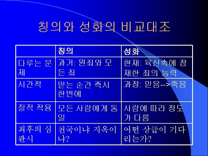 Present Body vs Resurrection Body (Erickson, 324; 1 Cor 15: 38 -52) 현재의 몸 부활의 몸 Perishable (썩어질 몸): Incorruptible (썩지 않는 몸): 질병과 썩음에서 자 질병과 죽음 유 Sown in dishonor Glorious (욕된 몸) (영광스러운 몸) Weak (약한 몸) Powerful (강한 몸) Physical (육적인 몸) Spiritual (영적인 몸)
