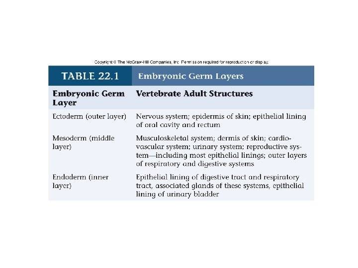 22. 1 Principles of Animal Development • Tissue stages of Development – Gastrulation: The invagination of cells into the blastocoel • Cells migrate to specific destinations • Form distinct cell layers- “germ” layers • Pore created by invagination is the blastopore – Early Gastrula has two layers of cells • Ectoderm- outer layer of cells • Endoderm- inner layer of cells – Lines the archenteron – Late gastrula- has three layers of cells • A middle mesoderm layer is formed