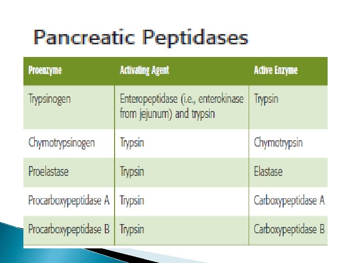 Polypeptidases Trypsinogen and chymotrypsinogen (proenzymes) are secreted by pancreas in response to protein in the small intestine They will be activated to trypsin and chymotrypsin (now called proteases)