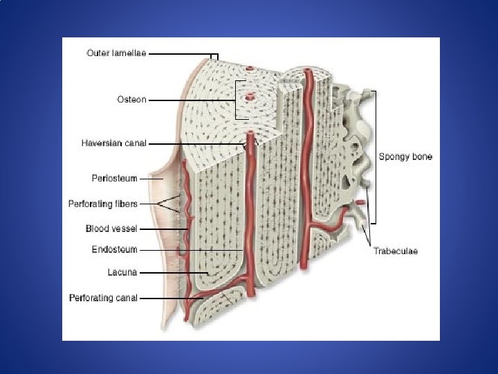 HAVERSIAN SYSTEM • Bone is traversed by longitudinal channels called Haversian canals. • Lamellae, osteocytes and central haversian canal form a system called haversian system or osteon, the structural unit of bone. • They anastomose with each other by oblique and traverser communications. • Each haversian canal is surrounded by varying number(5 -20) of concentrically arranged lamellae of bone matrix, these lamellae are called haversian lamellae.