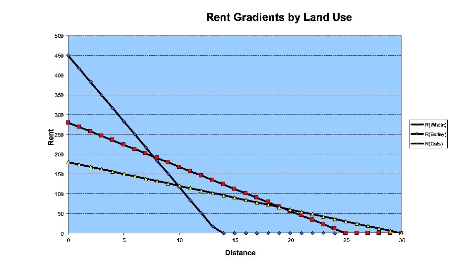 The model had a corresponding to conditions: set of assumptions early 19 th century 1. Isolation; There is one isolated market in an isolated state having no interactions (trade) with the outside. 2. Ubiquitous land characteristics; The land surrounding the market is entirely flat and its fertility uniform. 3. Transportation; It is assumed there are no transport infrastructures such as roads or rivers and that farmers are transporting their production to the market using horses and carts. Centrality Assumptions Isolated State Flat Land Same Transport Means Soil Quality No Rivers mountains Climate Constant Farmers behave rationally… Transportation costs are dependent on commodity type being transported as well as distance to the market involved.