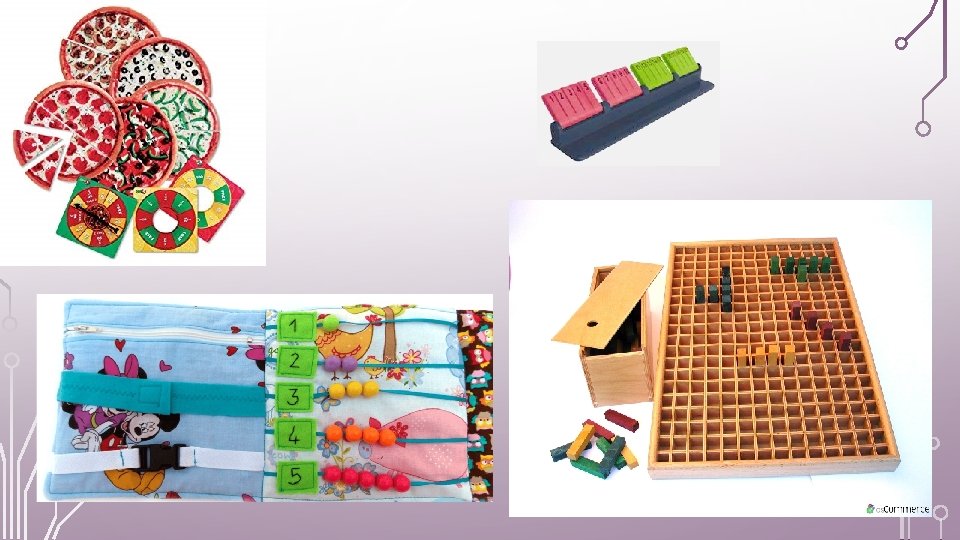 STRATEGIE DIDATTICHE 3 • ADATTAMENTO DEI MATERIALI: quelli che possono essere gestiti globalmente con efficacia anche senza vedere. • Necessità di dimensioni adeguate e con adattamenti facili da applicare: colle fili, sabbia ed altro materiale che sia differenziato al tatto • Linea del 20 con etichette braille/pizza braille con spago per frazioni/ casellario romagnoli anche “fai da te”