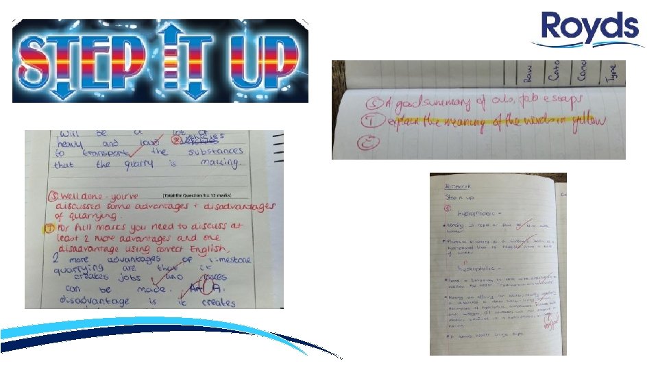 Teaching and Learning at Royds Structure - Royds Learning Thread Launch Explore Demonstrate Let’s g o look ing for lea rning! Key Features: Brain in Gear Learning Context Learning Aim Learning Outcomes (Essential and Excel) Annotated Seating and Interaction Plans Literacy Engagement Challenge Marking and Feedback - STEP it Up Strength Target Engage Progress . . . And remember to really ask. . . Are students engaged? Are they appropriately challenged? Are they making progress?