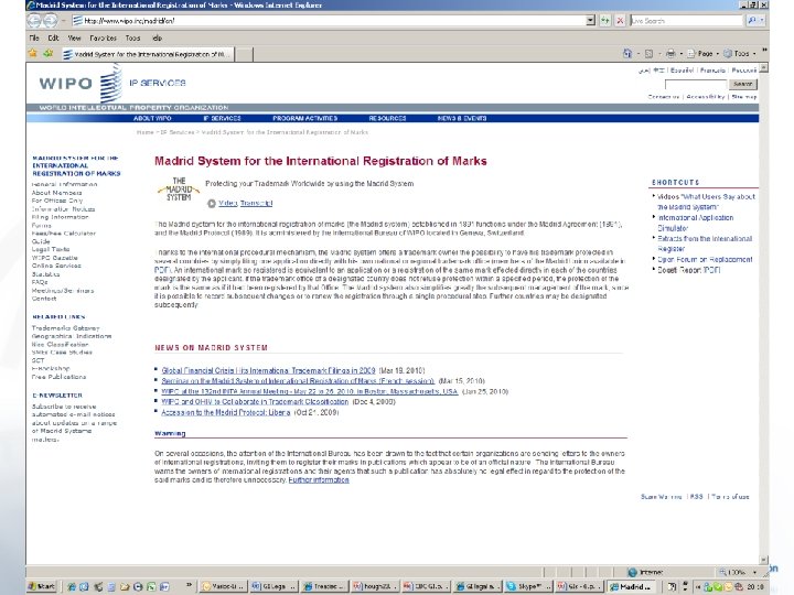Madrid Agreement and Protocol • • Concerning the International Registration of Marks (1891, last revision 1979) Protocol 1989 Collective Marks, Certification Marks or Guarantee Marks – Rule 9(4)(a)(x) of Common Regulations An application for international registration may be filed only by a natural person or legal entity having a connection, with a Contracting Party to the Agreement or the Protocol. A mark may be the subject of an international application only if it has already been registered with the Trademark Office of that Contracting Party The International Bureau records the mark in the International Register, publishes the international registration in the WIPO Gazette of International Marks, and notifies it to each designated Contracting Party. The effects of an international registration in each Contracting Party are, as from the date of the international registration, the same as if the mark had been deposited directly with the Office of that Contracting Party. • 56 parties (Agreement) 81 (Protocol) A total of 84 States to one/other (2009) •