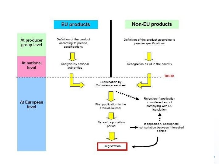 • A product may only be registered if: – it is produced using traditional raw materials; – it is characterized by a traditional composition or by a method of production/processing that corresponds to a traditional production/processing method. • In order to be registered, the name must: – be specific in itself; – indicate the specific character of the agricultural product or foodstuff. • Names that refer only to claims of a general nature, that are misleading for consumers cannot be registered. These rules apply without prejudice to Community rules governing intellectual property or concerning geographical indications and trademarks. •
