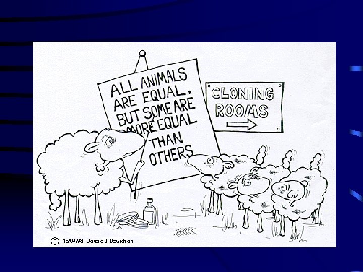 TREATING CLONES AS “SUB-HUMANS” • How can we treat sub-humans? • Will we have right to destroy clones at certain physical state and age to save medical care? • Will the discrimination of legislation between human and clone become slavery? • What if clones have significant support of the society?