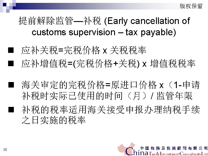 版权保留 进口设备提前解除监管 Early cancellation of customs supervision on imported production equipment 1. 补缴关税和进口环节增值税;Pay import duty and VAT 2. 补办进口许可证;Apply for import license 3. 补办《入境通关单备案》。Record filing for customs pass for import goods 9