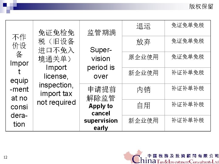 版权保留 设备监管期限已满 If equipment supervision period is over 1. 退运出境 Return to export country 2. 申请放弃 apply to abandon 3. 不退运不放弃(原企业继续使用),免交税款, 办理进口商品检验检疫,办进口许可证,机电办 审批进口后,办理解除监管手续 Not returned and abandoned (continuously used by existing company) 4. 结转(新企业使用)Transferred for use (by new company) 11