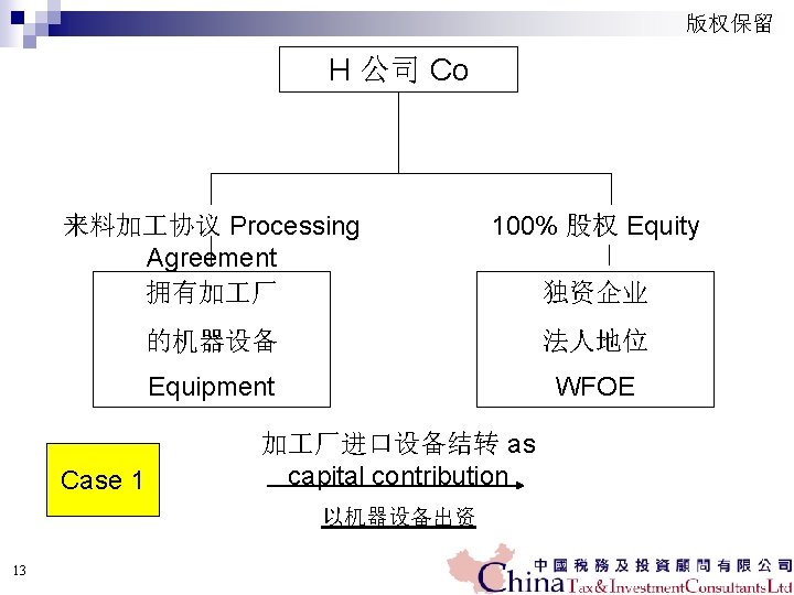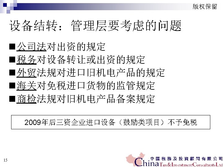 版权保留 H Company 来料加 协议进口设备清单 List of equipment per export processing agreement K Company 股本权益 equity 加 厂机器设备 独资企业法人地位 Equipment WFOE Case 2 设备结转(买卖交易)Buysell transaction (纳税交易 taxable transfer) 14