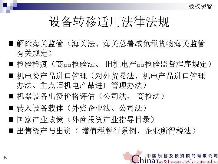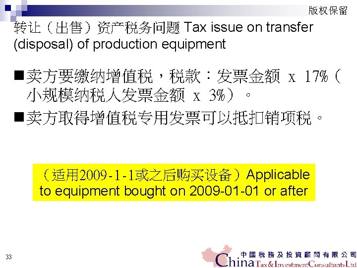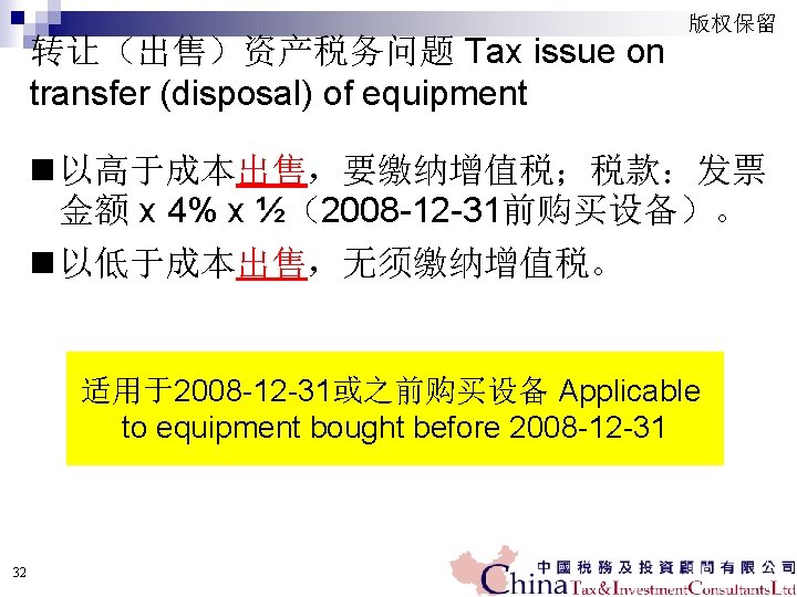 版权保留 国内购买设备转入独资企业 Transfer of domestically bought equipment to WFOE n 不属于海关监管范围、非进口设备 n Not imported and falling into scope of customs supervision 31