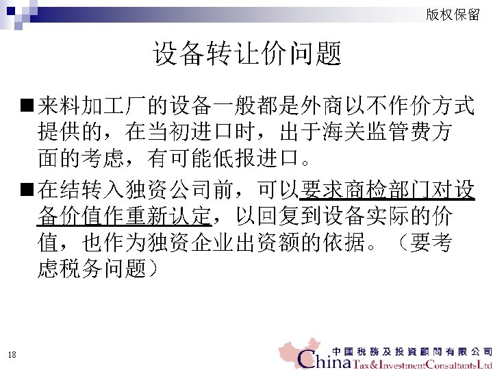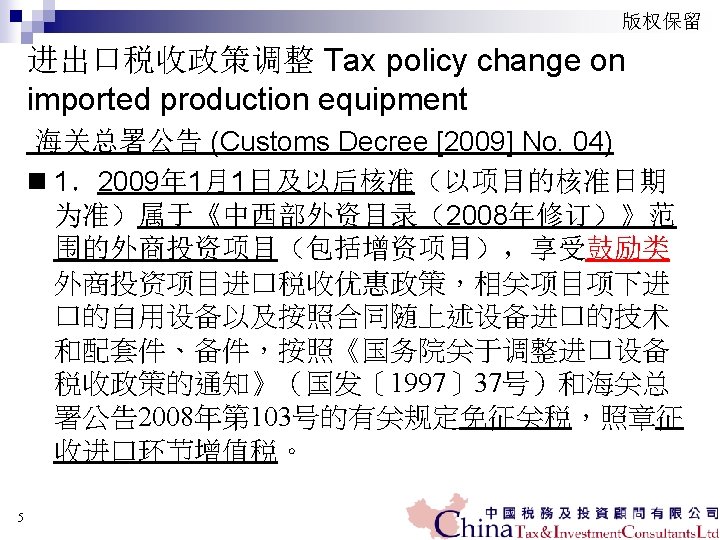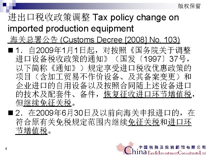 版权保留 来料加 不作价设备免税政策调整 Policy change on export processing equipment provided at no consideration n 增值税暂行条例 (1994. 1. 1) Repealed; n 国发[1997] 37号文 (1998. 1. 1) n 增值税暂行条例规定(第 15条)2009. 1. 1. 3