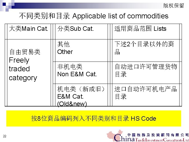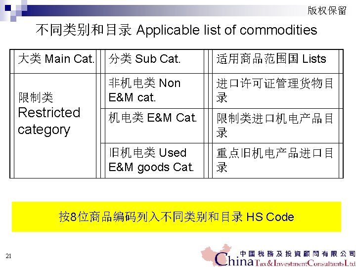 版权保留 机电产品进口管理 Import rules on electrical & mechanical goods 禁止类 Prohibited cat. 限制类 Restricted cat. 自由贸易类 Freely traded cat. 20 已解除监管 未解除监管 不适用 N/A 补证补单补税 License, record filing, tax