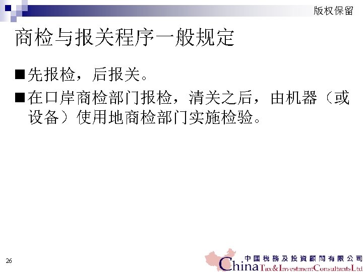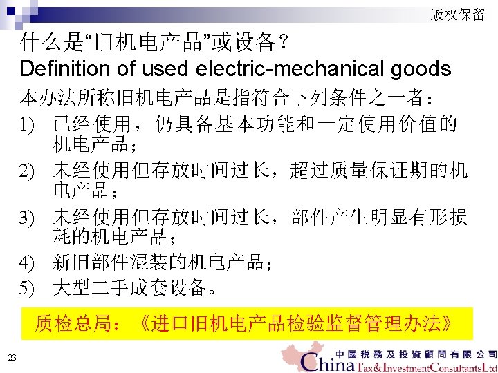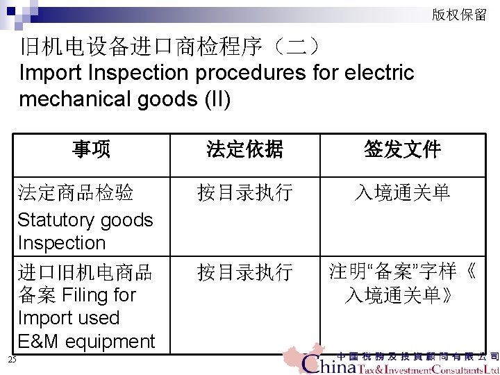 版权保留 旧机电设备进口商检程序(一) Import Inspection procedures for electric mechanical goods (I) 加注“备案”字样 入境通关单 不予备案 Not accepted for record filing 有条件备案 Conditional filing 可以备案 Acceptable for 24 filing 适用目录 Applicable lists ╳ 不予备案商品目录 有条件备案商品目录 上述目录以外商品