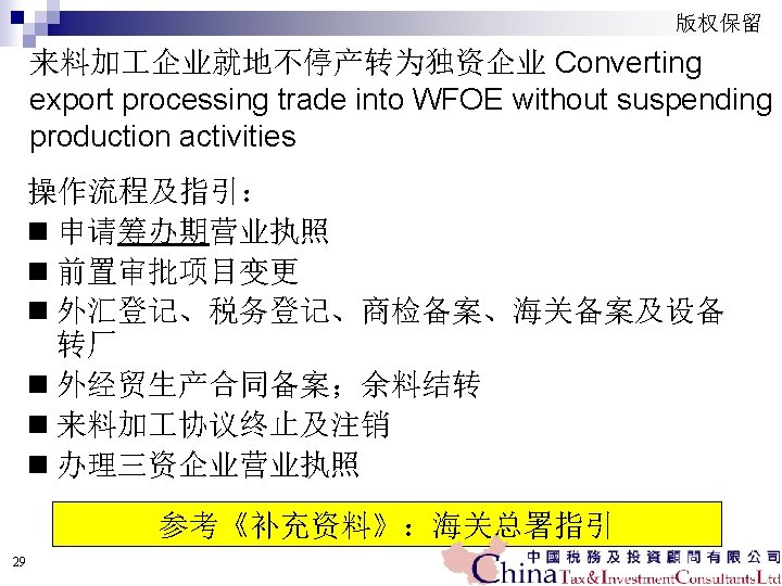 版权保留 海关监管设备结转操作(略) Transfer of equipment that are under customs supervision from one qualified user to another (Skipped) 28