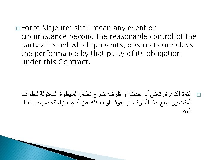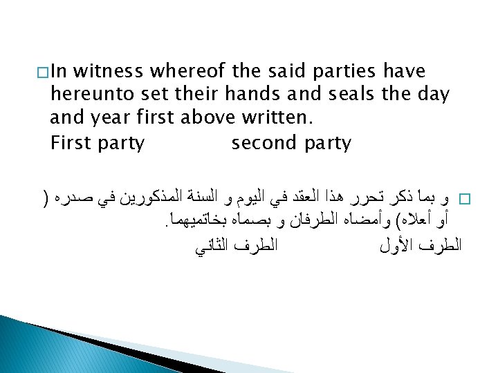 introduction � What is a contract? � Elements of a contract: Contract title Contract parties Legal capacity Preamble Mutual Obligations ﺍﺳﻢ ﺍﻟﻌﻘﺪ ﺍﻷﻄﺮﺍﻑ ﺍﻟﻤﺘﻌﺎﻗﺪﺓ ﺍﻷﻬﻠﻴﺔ ﺍﻟﻘﺎﻧﻮﻧﻴﺔ ﺗﻤﻬﻴﺪ ﺍﻹﻟﺘﺰﺍﻣﺎﺕ ﺍﻟﻤﺘﺒﺎﺩﻟﺔ