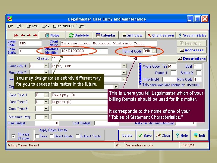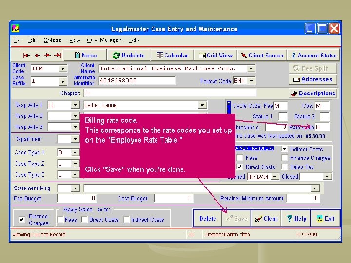 1) Name and address stuff, fairly straightforward. 2) Client Attorney, usually the “originating” attorney. Drop-down list from the employee table. 3) Office assigned to the client. Drop-down list from the Office table. 4) Client type, from the corresponding table. 5) Rate code. Enter one of the codes you created in the Employee rate table.