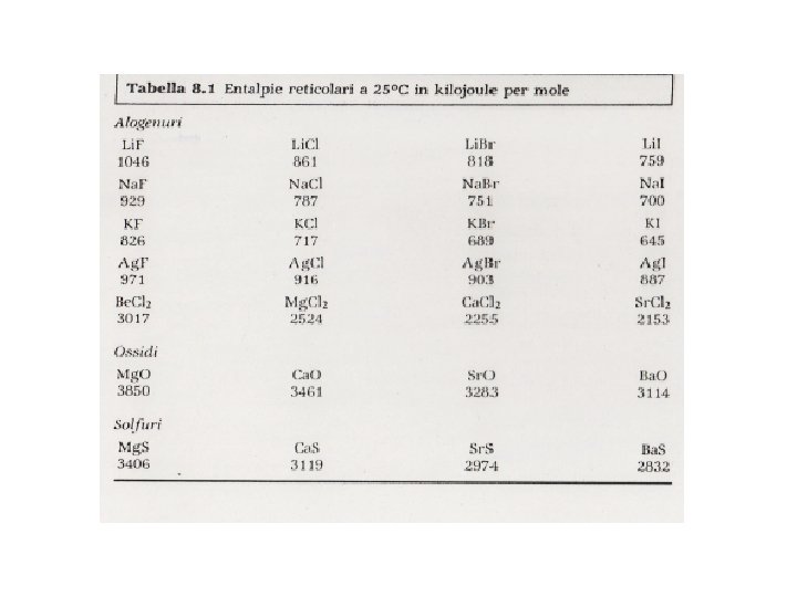 ENERGIA RETICOLARE Energia in gioco nel processo: MX (s) M+ (g) + X- (g) Coincide col ΔH di questa reazione se condotta a P=K (ΔHL) La formazione di un solido ionico a partire dagli ioni gassosi non interagenti è sempre un processo che sviluppa energia (il sistema si stabilizza, cioè diminuisce la sua energia interna). N. B. Lo sviluppo di energia in un processo è molto spesso indicativo della spontaneità dello stesso (ma NON sempre…) L’energia reticolare è tanto più elevata quanto più gli ioni interagenti sono piccoli e ad alta carica.