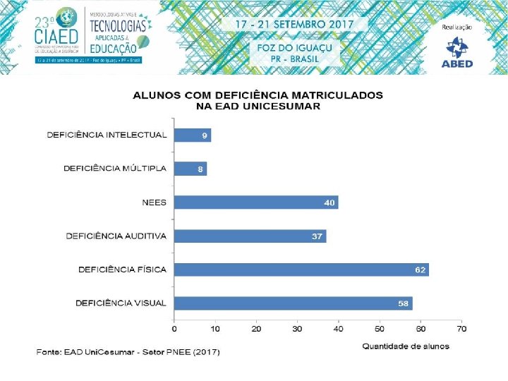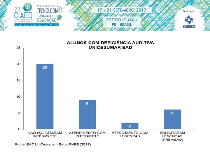 • Participantes: 37 alunos incluídos na educação a distância da instituição de ensino superior, com algum grau de deficiência auditiva ou surdez profunda. • Educação inclusiva – Modalidade à Distância - É necessário ofertar os meios que possibilitem a igualdade de condições para que todos tenham acesso ao conhecimento.