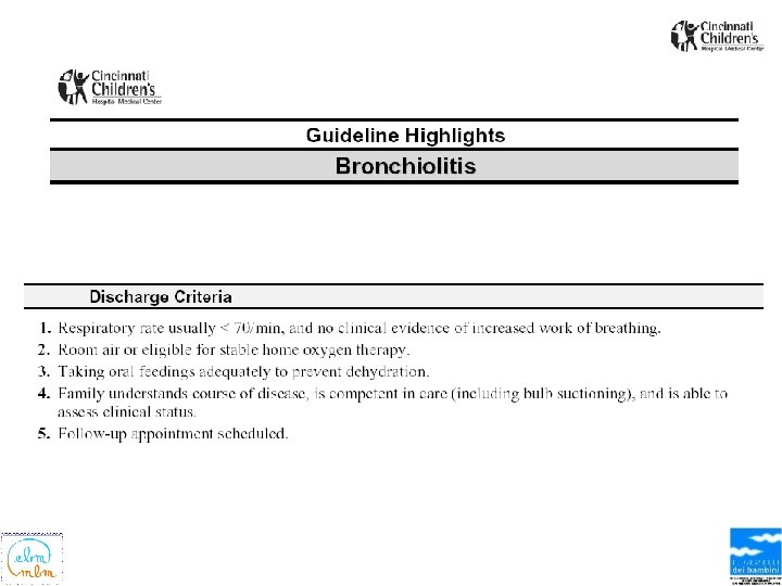 L’ Oggetto • GUIDELINE TITLE – Evidence-based clinical practice guideline for medical management of bronchiolitis in infants less than 1 year of age presenting with a first time episode. • BIBLIOGRAPHIC SOURCE(S) – Cincinnati Children's Hospital Medical Center. Evidence based clinical practice guideline for medical management of bronchiolitis in infants less than 1 year of age presenting with a first time episode. Cincinnati (OH): Cincinnati Children's Hospital Medical Center; 2006 May. 13 p. [85 references]
