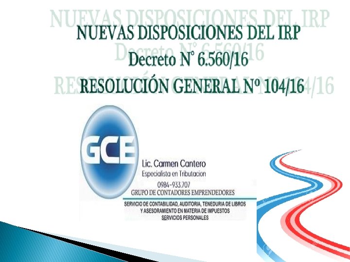 LEGISLACION IRP Ley Nº 2. 421/04 – art. 10° al 19° (modificado y actualizado por la Ley N° 4. 673/12) Decreto Nº 9. 371/12 Reglamentario del IRP (modificado por Dto. 6. 560/16). Decreto Nº 10. 701/13 Retenciones IRP a Diplomáticos Decreto Nº 6. 560/16 Disposiciones propias. Resoluciones Generales N°s: 80/12, 83/12, 90/12 (Derogados por la Resolución General N° 104/16) Resolución General Nº 98/13 Reglamento Dto. 10. 701/13 Resolución General Nº 82/16 Informe IRP Medianos, Grandes y Entidades Públicas. Resolución General Nº 104/16 Nuevo Reglamento del IRP.