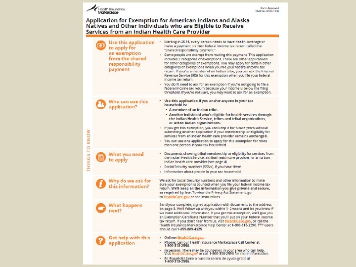 Affordable Care Act Individual Mandate & Exemption • • What is the ACA Tax Penalty? What is the I/T/U Hardship Exemption and who is eligible? How to apply for the Indian Exemption or I/T/U Hardship Exemption? Additional Information related to exemptions and the application: – HHS instruction are forthcoming, tax filing information, – Do you need to reapply for the exemption? – What can you do to help Tribal members? • Education Tribal members and program beneficiaries • Make sure Tribal members understand the difference between Indian Exemption and the Hardship Exemption • Prepare to offer eligibility letters • • Provide tax filing assistance 2014 Penalty = 1% household income; $95/adult 2015 Penalty = 2% household income; $325/adult 2016 Penalty = 2. 5% household income; $695/adult