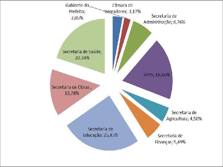 RESUMO GERAL DA DESPESA – POR ÓRGÃOS Órgão Valor Total Percentual Câmara de Vereadores R$ 1. 100. 000, 00 3, 17% Gabinete do Prefeito R$ 712. 250, 00 2, 05% Secretaria de Administração R$ 2. 344. 150, 00 6, 76% RPPS R$ 6. 402. 329, 58 18, 46% Secretaria de Agricultura R$ 1. 559. 250, 00 4, 50% Secretaria de Finanças R$ 1. 904. 199, 46 5, 49% Secretaria de Educação R$ 8. 827. 900, 00 25, 45% Secretaria de Obras R$ 4. 780. 056, 95 13, 78% Secretaria de Saúde R$ R$ 7. 051. 687, 38 34. 681. 823, 37 20, 34% TOTAL 100, 00%