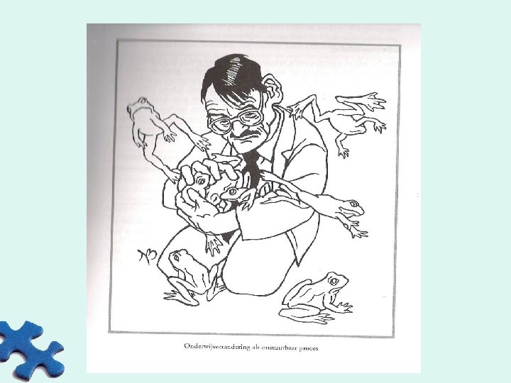 EEN KNIPOOG NAAR ONDERWIJSINNOVATIE De ‘wijze’ lessen van Fullan 1. Mensen kunnen niet veranderd worden. 2. Onderwijsverandering is op reis gaan via een onzekere route. 3. Problemen bieden perspectief. 4. Visie en planning werken eerder achteraf dan vooraf. 5. Individu en team tellen even zwaar mee. 6. Een aanpak van zowel van onderuit als van bovenop is van belang. 7. Relaties met de omgeving beïnvloeden succes. 8. Iedereen is ‘change agent’.