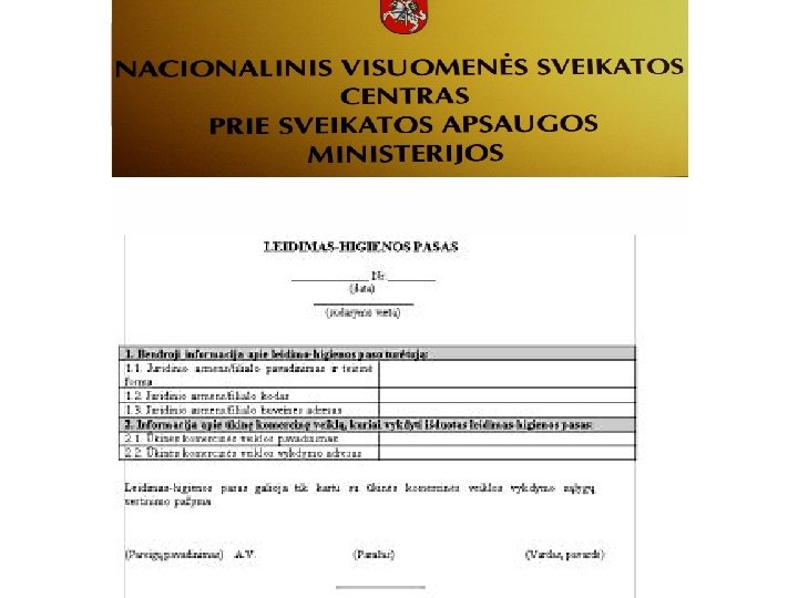 Teikiami dokumentai 13. 1. Nustatytos formos paraiška gauti leidimą-higienos pasą (Taisyklių 1 priedas) 13. 2. fiziniai asmenys – asmens tapatybę įrodančio dokumento kopija