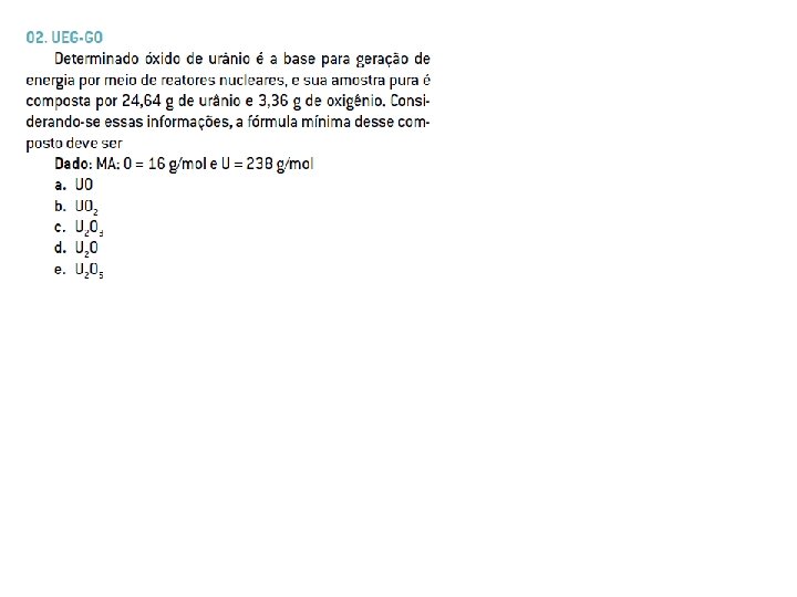 Exemplo Calcule a fórmula mínima de um composto que apresenta 43, 4% de sódio, 11, 3% de carbono e 45, 3% de oxigênio (massas atômicas: Na = 23, C = 12, O = 16).