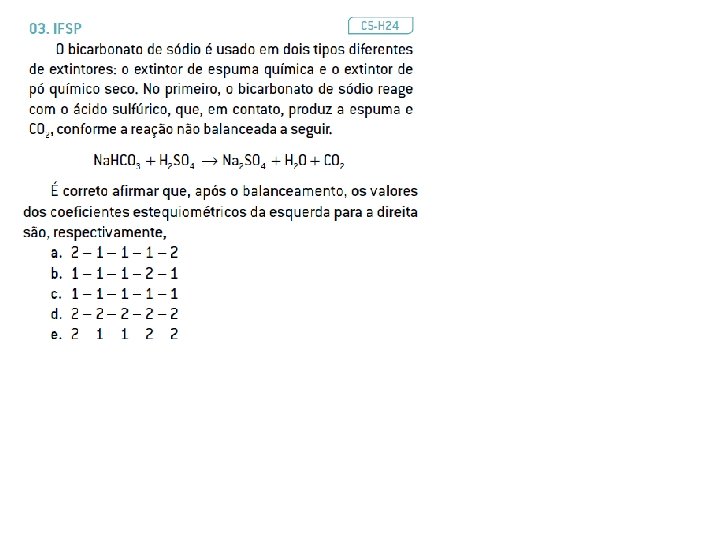 Exemplos A) 2 H 2 + O 2 2 H 2 O B) Zn + 2 HCl H 2 + Zn. Cl 2 C) 2 Na. OH + 1 H 2 SO 4 1 Na 2 SO 4 + 2 H 2 O D ) 1 C 2 H 5 OH + 3 O 2 2 CO 2 + 3 H 2 O