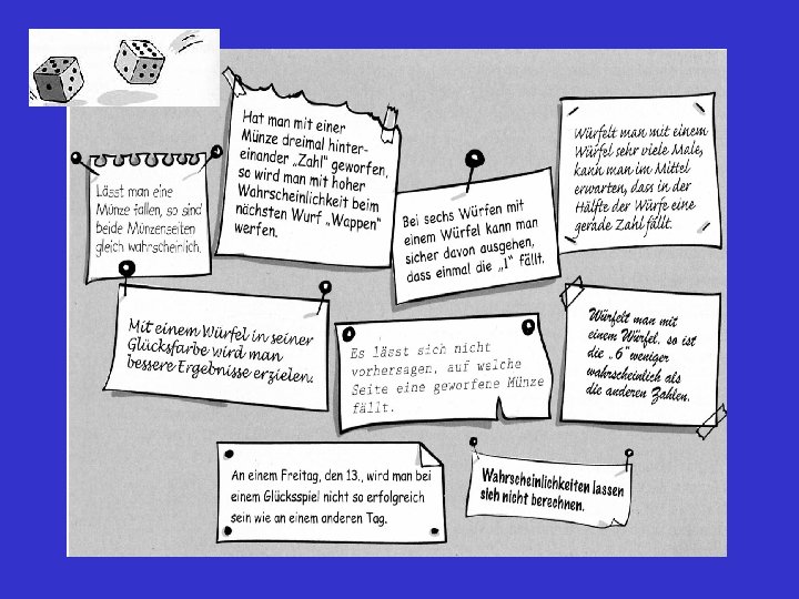 Relative Häufigkeit und Wahrscheinlichkeit Bei vielen Zufallsversuchen (Ziehen einer Kugel aus einem Behälter, Werfen eines Würfels, …) lassen sich die Wahrscheinlichkeiten der möglichen Ergebnisse durch - die Annahme gleicher Chancen (bedingt z. B. durch die Symmetrie der Zufallsgeräte) für die möglichen Ergebnisse bestimmen. Wie groß ist aber die Wahrscheinlichkeit mit dem Reißnagel „Seite“ zu werfen? Hier müssen Sie ein Experiment durchführen.