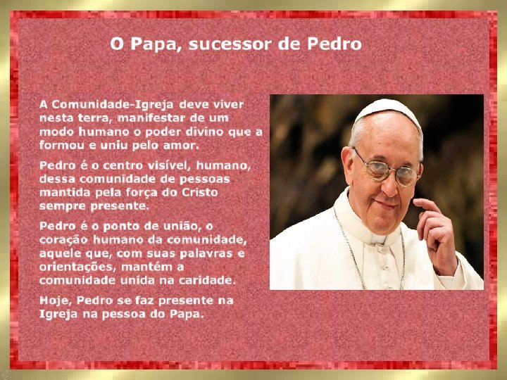 Créditos Coordenação geral e texto: P. José Geraldo Rodrigues vivencias@aparecidadasaguas. com Ilustrações: Internet Músicas: Hino Pontifício Formatação PPS: Altiva Helena Vídeo: Altiva Helena http: //www. aparecidadasaguas. com