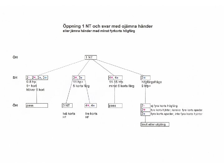 1 NT - 2 ♣ • 2♦ = Jag har ingen 4 korts högfärg • 2♥ = Jag har 4 korts hjärter och kanske 4 korts spader. • 2♠ = Jag har minst 4 korts spader, men inte 4 korts hjärter.