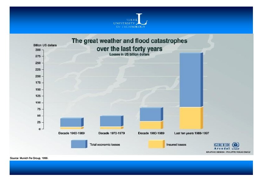Väder år 2000 • År 2000 drabbades Atlanten av 15 orkaner • Svåra flodöversvämningar till följd av extrem nederbörd i många länder bl. a. Schweiz, Sverige • Svår torka drabbade sydöstra Europa, Mellanöstern m. fl. • I Nordamerika var torkan och medföljande markbränder den värsta på 50 år