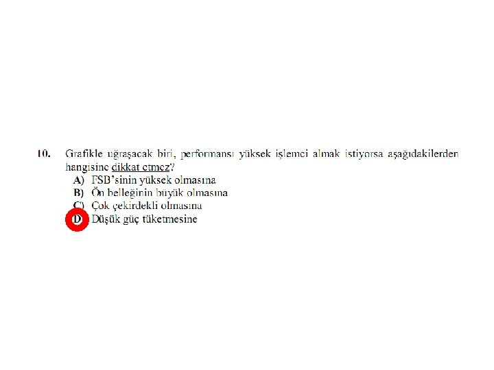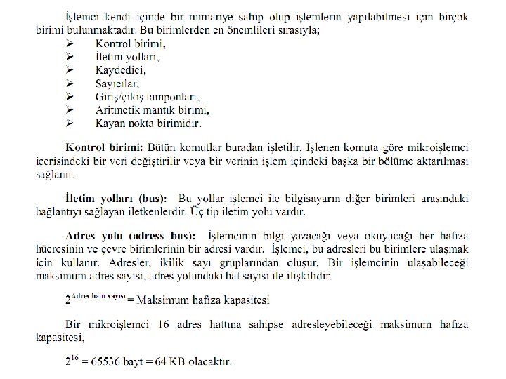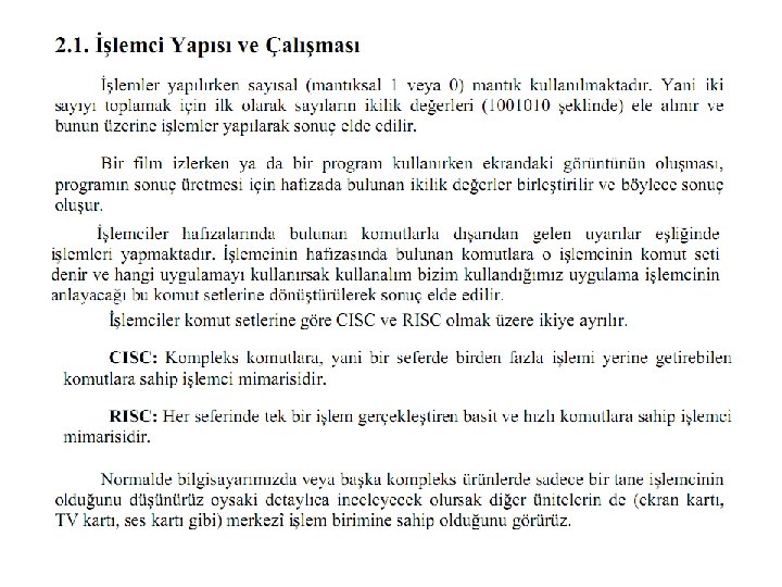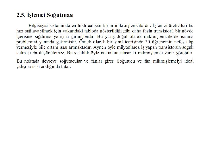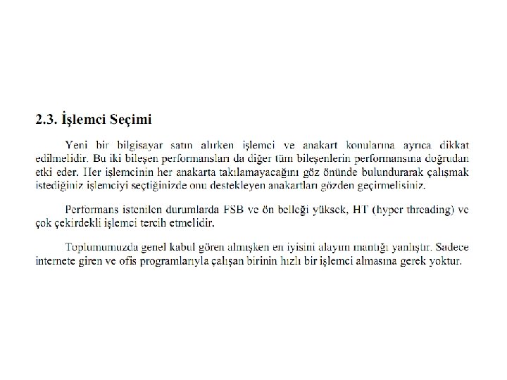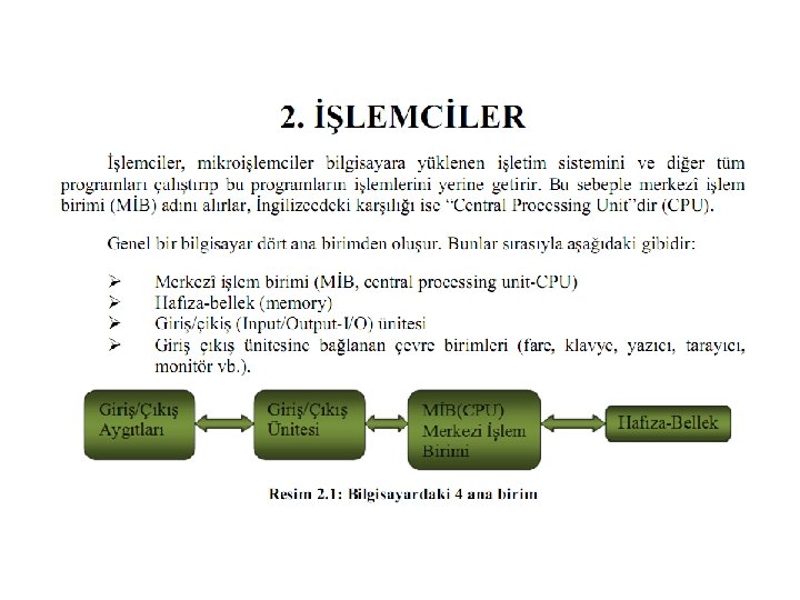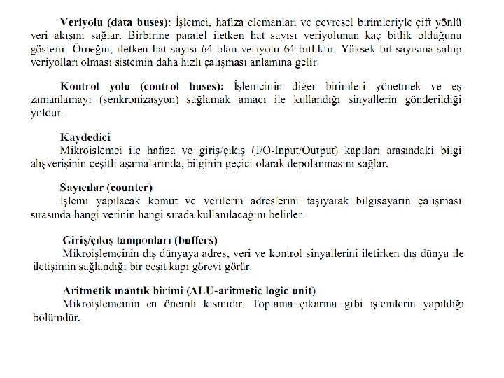 Ön Bellek (Cache) : Sistem belleğinden gelen veriler, çoğunlukla CPU’nun hızına yetişemezler. Bu problemi çözmek için CPU içinde yüksek hızlı hafızalar bulunur. Ön bellek çalışmakta olan programa ait komutların, verilerin geçici olarak saklandığı yüksek hızlı hafızalardır. Overclock (Hız Aşımı, Hız Aşırtma) : İşlemcinin üreticinin etikette belirlediği hız değerinden yüksek değerlerde çalıştırılması işlemidir.
