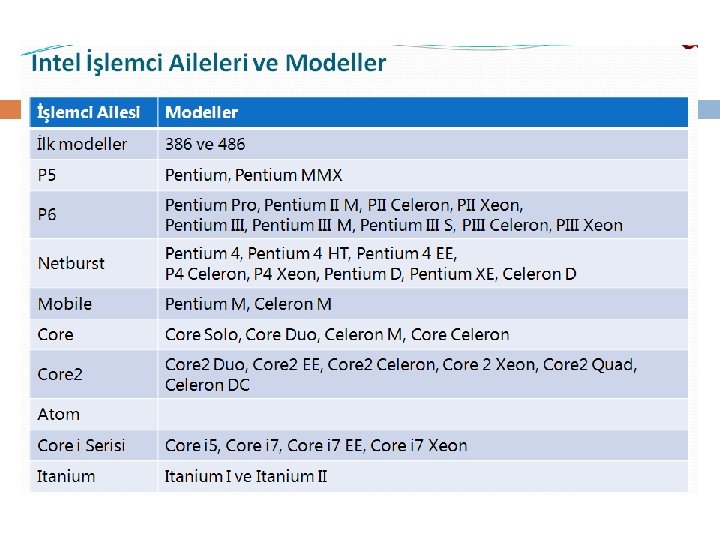 Intel CPU Paketleri CPU Paketi Modeller LGA 1366 Core i 7 LGA 1156 Core i 3, Core i 5, Core i 7, Xeon Socket 441 Atom Socket P Core 2 Duo, Core 2 Quad, Celeron M, Celeron DC Socket M Core Solo, Core Duo, Core 2 Duo, Celeron M Socket J Xeon LGA 775 Pentium 4, Celeron D, Pentium D, Core 2 Duo, Core 2 Quad, Xeon, Celeron Socket 495 Celeron Socket 479 Pentium M, Celeron M Socket 478 Pentium 4, Celeron D Socket 423 Pentium 4 Socket 370 Pentium III, Celeron Slot 1 Pentium II, Pentium III, Celeron