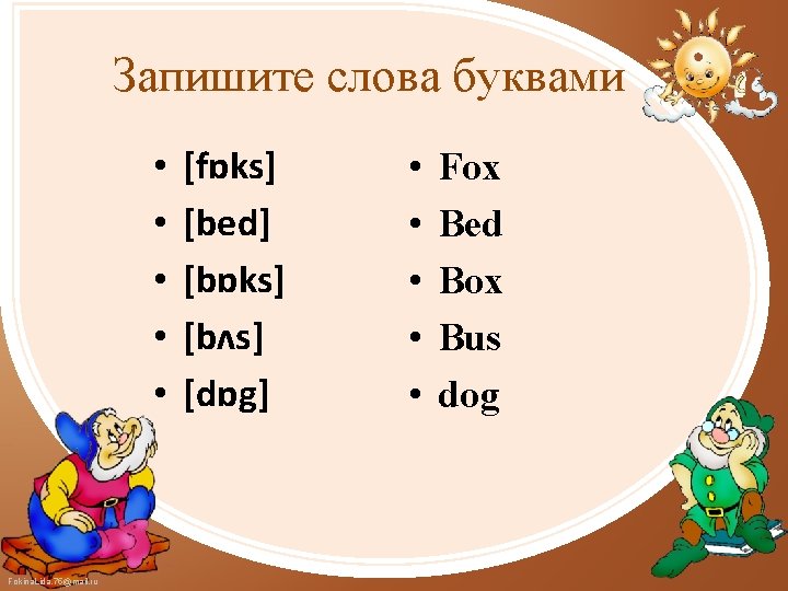 Укажите слова в которых есть звук [æ] 1. Fox 2. Dog 3. Egg 4. Ant 5. Cat 6. Hat 7. Ice 8. Jam 9. Giraffe 10. Pig 11. Queen Fokina. Lida. 75@mail. ru