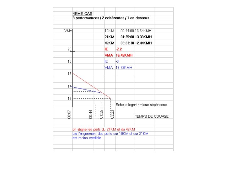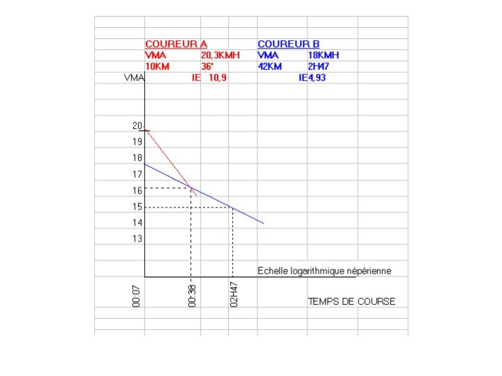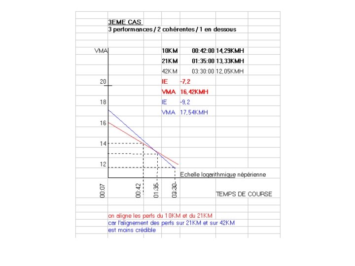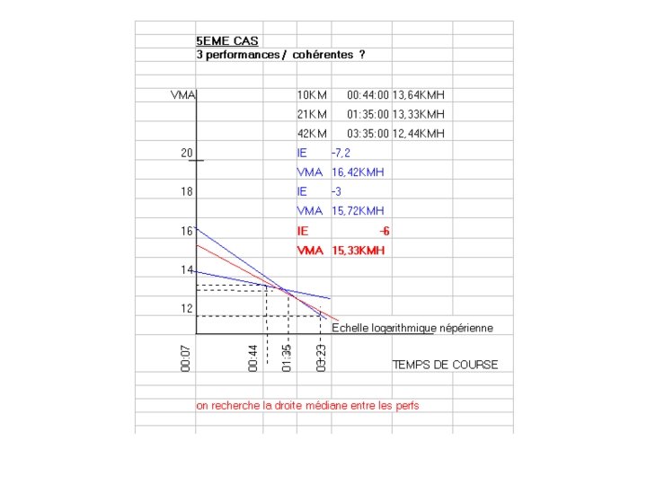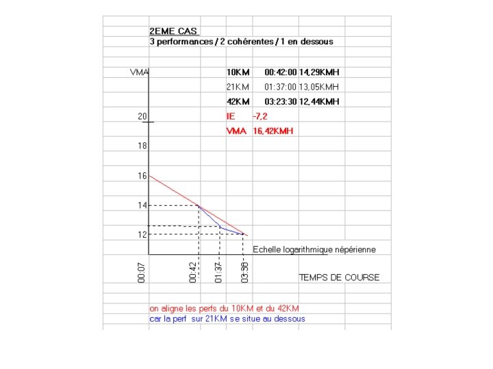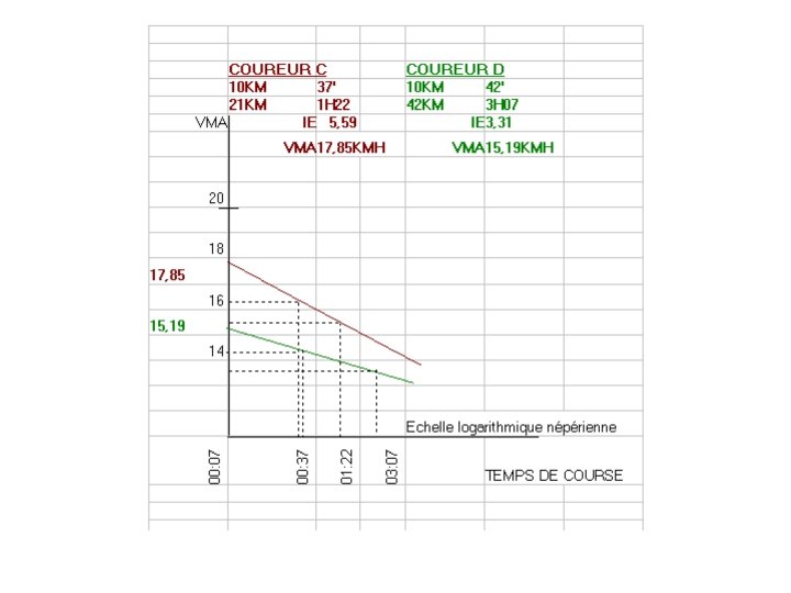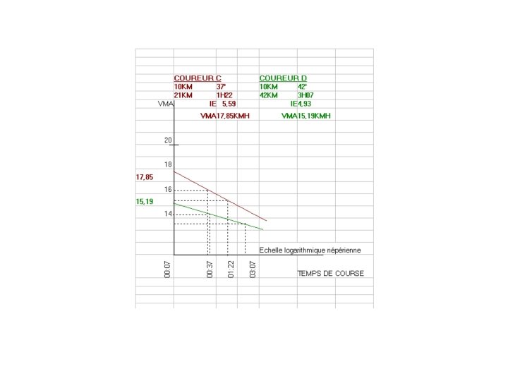 Exemple : Coureur C temps sur 10 KM = t 1 = 37 mn ===> V 1 = 16, 22 KMH ==> L 1 = ln ( 7 / 37 ) = - 1, 665 temps sur 21 KM = t 2 = 1 H 22 mn ===> V 2 = 15, 44 KMH ==> L 2 = ln ( 7 / 82 )= - 2, 46 VMA = (16, 22)(-2, 46) - (15, 44)(-1, 665) / (-2, 46 ) - (-1, 665) = (-39, 9) - (-25, 7) / -0, 795 = -14, 2 / -0, 795 VMA = 17, 85 KMH Exemple : Coureur D temps sur 10 KM = t 1 = 42 mn ===> V 1 = 14, 29 KMH ==> L 1 = ln ( 7 / 42 ) = - 1, 791 temps sur 42 KM = t 2 = 3 H 07 mn ===> V 2 = 13, 54 KMH ==> L 2 = ln ( 7 / 187 ) = - 3, 285 VMA = (14, 29)(-3, 285) - (13, 54)(-1, 791) / ( -3, 285) - (-1, 791) = (-46, 94) - (-24, 25) / -1, 494 = -22, 69 / -1, 494 VMA = 15, 19 KMH