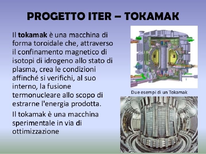 LA FUSIONE DELL'IDROGENO Il principio della fusione consiste nel far fondere due nuclei di idrogeno, in modo da ottenere un nucleo di elio trasformatosi così in energia. Gli atomi interessati dal processo di fusione nucleare sono degli isotopi dell'atomo di idrogeno, cioè elementi caratterizzati da minimo numero atomico. Se accanto ad essi (come nella fissione), si trovano altre molecole di idrogeno, viene scatenata una reazione a catena provocando una grande quantità di energia. Affinché la fusione avvenga serve una fortissima pressione a una temperatura pari a 100 milioni di gradi centigradi, questo tipo di condizioni si manifestano solo nelle stelle come il Sole, infatti parte della luce che esso produce è creato dalla fusione.