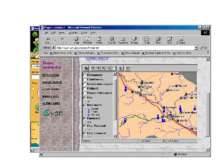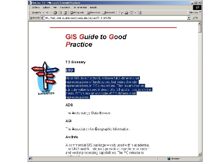 Geography Markup Language • GML: representación en XML de los elementos simples (línea, polígono. . . ) según los estándares Open. GIS • Elementos más complejos en la ver 3. 0 (inminente) • Formará la base para intercambio de información geográfica, entre sistemas, proveedores y usuarios • Describe la representación interna, no la gráfica <Polygon name="extent" srs. Name="epsg: 4367"> <Line. String name="ring" srs. Name="epsg: 4367"> <CList>0. 0, 0. 0 1. 123, 1. 56 2. 34, 4. 5 0. 0, 0. 0</CList> </Line. String> </Polygon>
