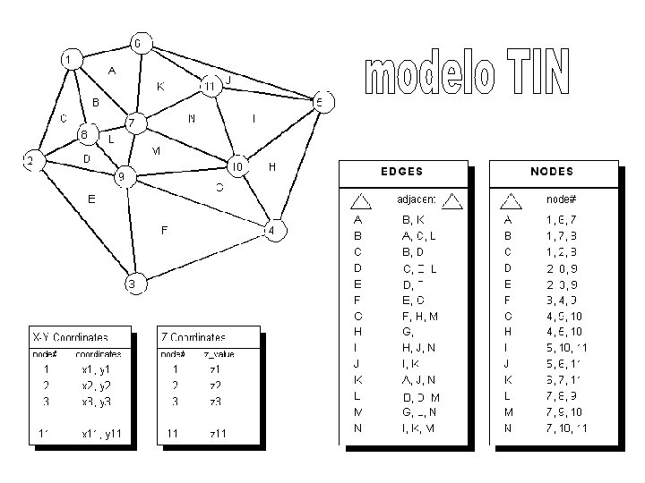 Modelo de datos vectorial • Primitivas geométricas – celda 0 D: punto (vértice, nodo) – celda 1 D: segmento, línea recta – arco: curva matemática (Bezier, b-spline) • Elementos complejos – polilínea: secuencia de líneas – polígono: anillo cerrado de líneas/polilíneas – superficie: TIN • Ignorados los elementos del mundo 3 D – aristas, caras, sólidos (polihedros)