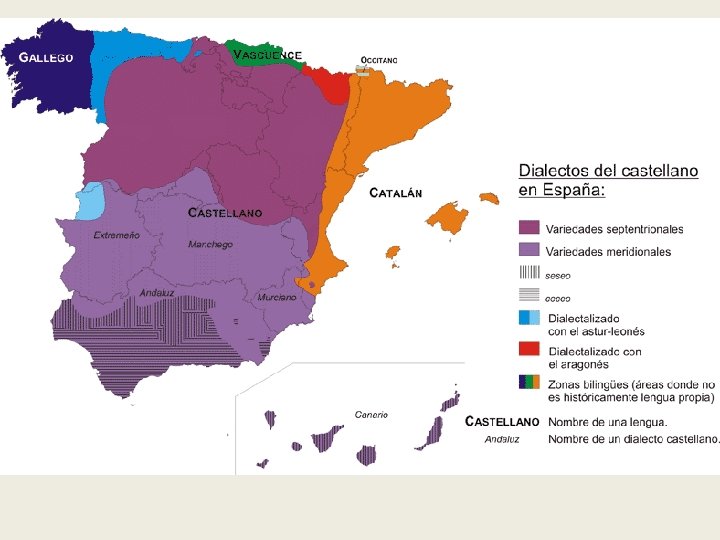 El castellano en zonas bilingües q En contacto con el catalán: • Pronunciación de –d final como sorda • Articulación velarizada de –l final • Interferencias gramaticales: preposiciones, artículo con nombre propio, dequeísmo… q En contacto con el euskera: • Alteraciones en el orden de la frase • Uso del condicional por el imperfecto de subjuntivo • Leísmo q En contacto con el gallego: • Geada • Reducción de grupos consonánticos • Preferencia por el perfecto simple