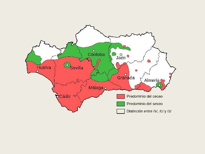 El andaluz Es el dialecto más diferenciado de todos. Algunos rasgos: • Zona ceceante, más cercana a la costa: Las cozas deben decirce con cenzillez • Zona seseante, interior: Las cosas deben desirse con sensillez • Yeísmo: Quien no ha visto seviya no ha visto maraviya • Pérdida de /d/ intervocálica e inicial: Me que'aré en la calle to'a la madruga‘a Pronunciación de la ch fricativa La mushasha tiene osho shiquillos Relajación en la pronunciación de consonantes en general