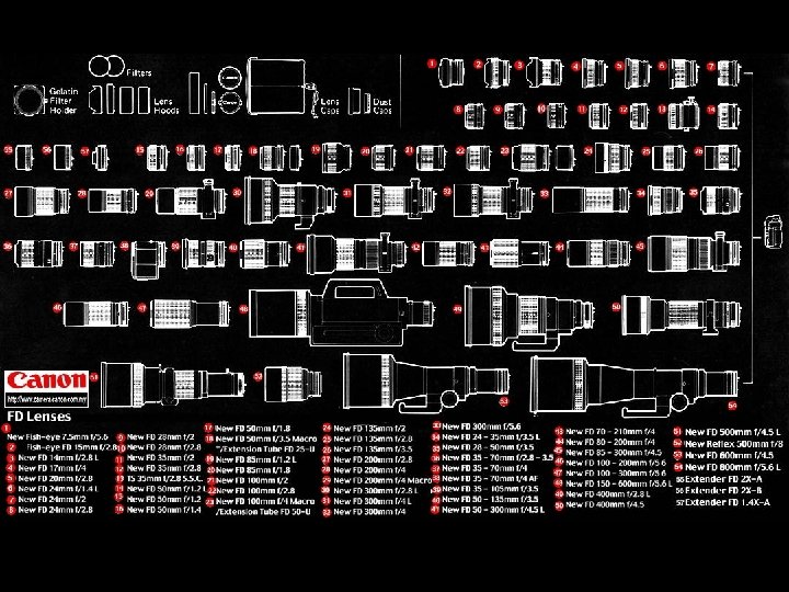 Panjang fokus (focal length) Jarak antara Pusat Lensa dengan Titik Api dari lensa tersebut Dalam satuan mm. 1: 1, 4 / 50 mm 1: 2, 8 / 135 mm 1: 4 / 300 mm 1: 3, 5 / 35 – 105 mm - lensa vario / zoom ( lensa dg panjang focus yang variable ) Panjang focus yang berbeda mengakibatkan sudut pandang yang berbeda.