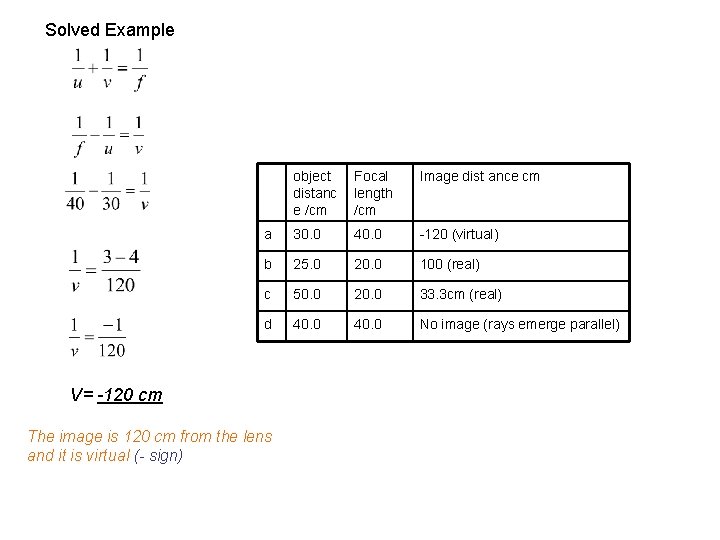 Solved Example object distanc e /cm Focal length /cm Image dist ance cm a 30. 0 40. 0 -120 (virtual) b 25. 0 20. 0 100 (real) c 50. 0 20. 0 33. 3 cm (real) d 40. 0 No image (rays emerge parallel) V= -120 cm The image is 120 cm from the lens and it is virtual (- sign)