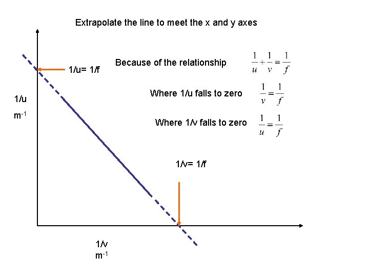Extrapolate the line to meet the x and y axes 1/u= 1/f Because of the relationship Where 1/u falls to zero 1/u m-1 Where 1/v falls to zero 1/v= 1/f 1/v m-1