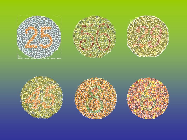 **Daltonismo** • Prueba para la detección del daltonismo Los carteles de Ishihara forman parte de las pruebas habituales para la ceguera a los colores. Las personas con visión normal de los colores ven todos los carteles con facilidad, mientras que aquellas con alteraciones para el rojo y el verde presentarán dificultades en, por lo menos, una de las imágenes. A continuación presentamos los carteles de Ishihara, que le permitirán descartar si usted padece Daltonismo.