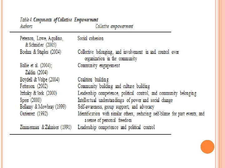 Page, N. , & Czuba, C. E. (1999). Empowerment: What is it? Journal of Extension, 37(5), 24– 32. Parpart, J. L. , Rai, S. M. , & Staudt, K. (2003). Rethinking empowerment: Gender and development in a global/local world. New York: Routledge. Peterson, N. A. , Lowe, J. B. , Aquilino, M. L. , & Schnider, J. E. (2005). Linking social cohesion and interactional empowerment: Support and new implications for theory. Journal of Community Psychology, 33(2), 233– 244. Peterson, N. A. , & Reid, R. J. (2003). Path to psychological empowerment in an urban community: Sense of community and citizen participation in substance abuse prevention activities. Journal of Community Psychology, 31(1), 25– 38. Robins, S. P. , Chatterjee, P. , & Canda, E. R. (1998). Contemporary human behavior theory: A criti- cal perspective for social work. Boston, MA: Allyn and Bacon. Rossing, B. , & Glowacki-Dudka, M. (2001). Inclusive community in a diverse world: Pursuing an elu- sive goal through narrative-based dialogue. Journal of Community Psychology, 29(6), 729– 743. Secret, M. , Jordan, A. , & Ford, J. (1999). Empowerment evaluation as a social work strategy. Health and Social Work, 24(2), 120– 138. Secret, M. , Rompf, E. L. , & Ford, J. (2003). Undergraduate research courses: A closer look reveals complex social work student attitudes. Journal of Social Work Education, 39(3), 411– 422. Senderowicz, Y. M. (2004). Figurative synthesis and synthetic a priori knowledge. The Review of Metaphysics, 57(4), 755– 785. Solomon, B. (1976). Black empowerment: Social work in oppressed communities. New York: Columbia University Press. Speer, P. W. (2000). Intrapersonal and interactional empowerment: Implication for theory. Journal of Community Psychology, 28(1), 51– 61. Sprague, J. , & Hayes, I. (2000). Self-determination and empowerment: A feminist standpoint analy- sis of talk about disability. American Journal of Community Psychology, 28(5), 671– 695. Spreitzer, G. M. , Kizilos, M. A. , & Nason, S. W. (1997). A dimensional analysis of the relationship